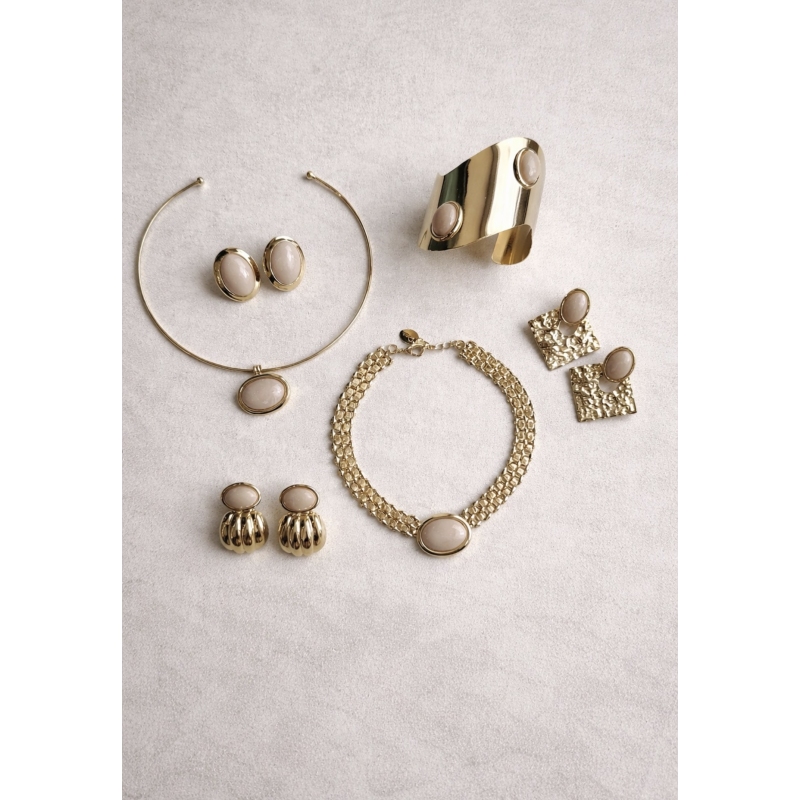 Bracciale rigido dal design a onda essenziale e raffinato, caratterizzato da una linea pulita che avvolge delicatamente il polso. Le due estremità sono impreziosite da pietre cabochon ovali incastonate in una montatura dorata, che donano luce ed eleganza al gioiello.