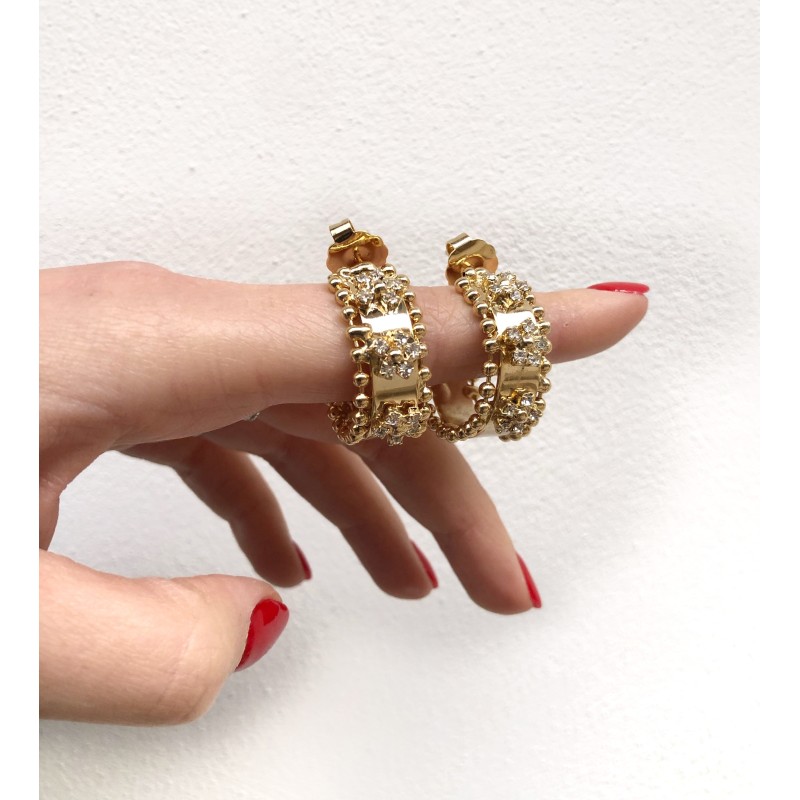 Orecchini cerchi con fiorellini in strass saldati su una base di ottone galvanizzato.