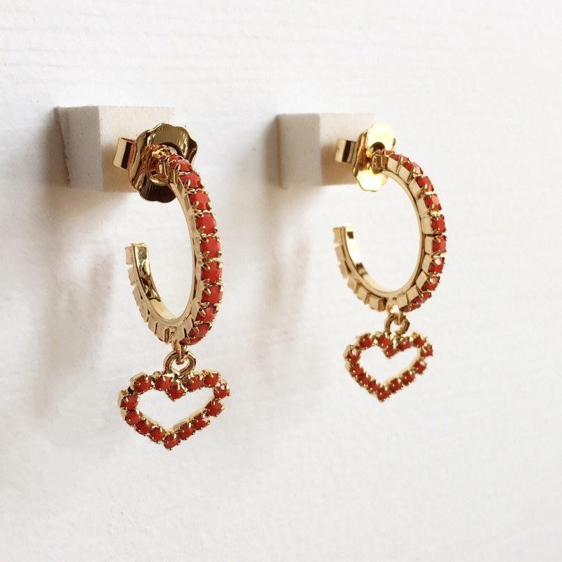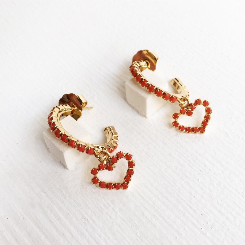 Cerchietti in strass colorati con cuore pendente, in ottone galvanizzato oro. Diametro cerchio 1,5cm. Nichel free.