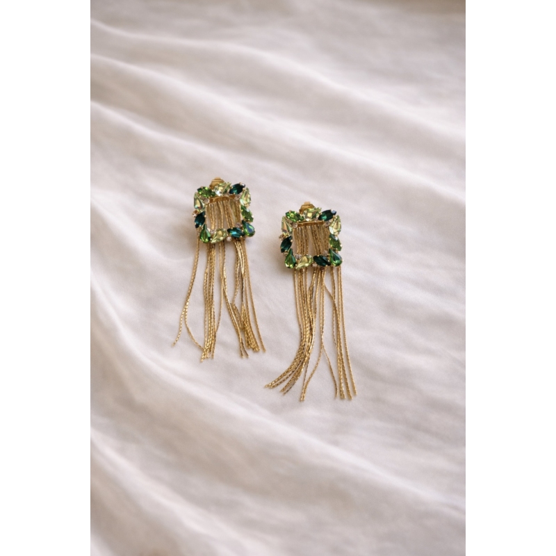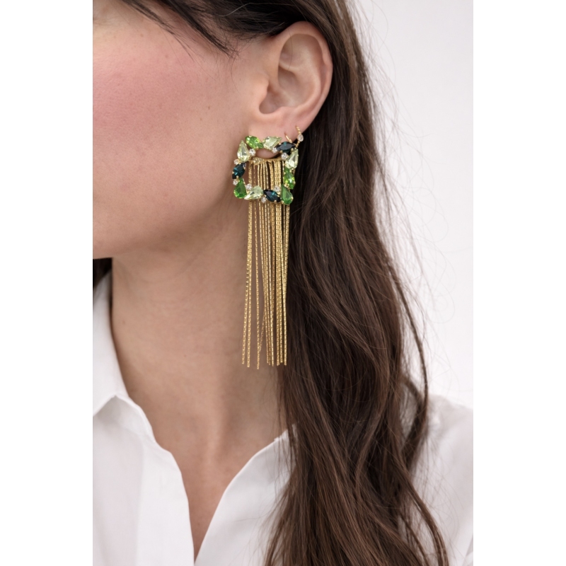 Gli orecchini Eloise sono un accessorio elegante e versatile, pensato per accompagnarti nei momenti speciali. Il loro design raffinato con cristalli sfaccettati incastonati in una struttura dorata illumina il viso, mentre le frange sottili aggiungono movimento e un tocco sofisticato.