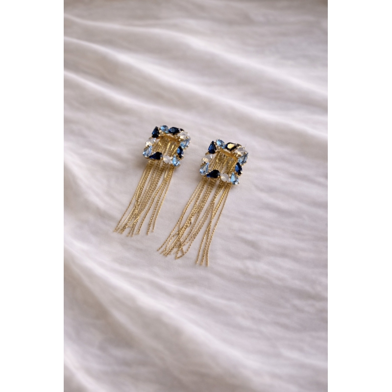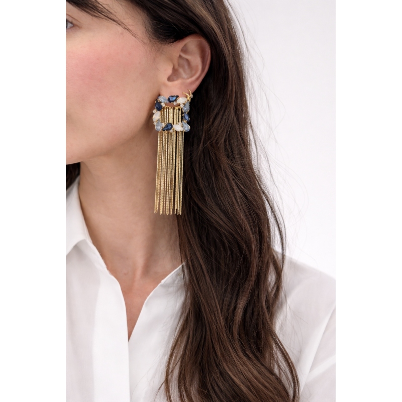 Gli orecchini Eloise sono un accessorio elegante e versatile, pensato per accompagnarti nei momenti speciali. Il loro design raffinato con cristalli sfaccettati incastonati in una struttura dorata illumina il viso, mentre le frange sottili aggiungono movimento e un tocco sofisticato.